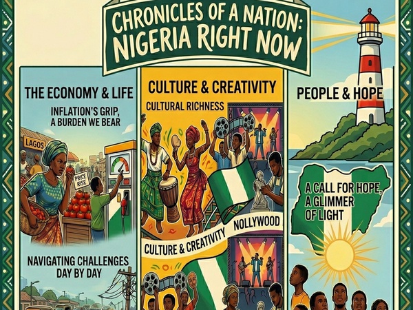 <p><strong>A Land of Contrast, Hopes, and Struggle</strong></p><p>In the heart of West Africa, where rivers weave,</p><p>And ancient cultures subtly weave,</p><p>There's a nation pulsing with vibrant life,</p><p>Where joy and struggle often collide.</p><p>Inflation's Grip, a Burden We Bear</p><p>The markets buzz, a lively scene,</p><p>But prices soar, a sight unseen.</p><p>From food to fuel, the cost rises high,</p><p>Leaving many to wonder why.</p><p>"Suffer head" they call it, a bitter tune,</p><p>As they navigate the sun and the moon.</p><p><br/></p><p><strong>Navigating Challenges, Day by Day</strong></p><p>Infrastructure's state, a common refrain,</p><p>Power outages, a recurrent pain.</p><p>Roads that demand careful repair,</p><p>Adding to the burdens people must share.</p><p>But despite the obstacles that they face,</p><p>Resilience flourishes in this very place.</p><p><br/></p><p><strong>Cultural Richness, a Source of Pride</strong></p><p>From Nollywood's magic to music's sweet sound,</p><p>Nigerian talent knows no bound.</p><p>The rhythms of life, they fill the air,</p><p>A testament to a culture beyond compare.</p><p>In diversity, there's strength, a unity too,</p><p>A vibrant tapestry, green, white, and blue.</p><p><br/></p><p><strong>A Call for Hope, a Glimmer of Light</strong></p><p>The path forward, not always clear,</p><p>With whispers of doubt and the presence of fear.</p><p>But in every corner, there's hope alive,</p><p>A flicker of something that will survive.</p><p>For Nigeria's story is one yet unwritten,</p><p>A testament to a nation truly smitten.</p>