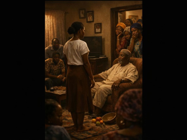 <p>I have always known how to disappear in loud rooms full of people.</p><p>Especially rooms that share my blood.</p><p>But today I can’t.</p><p>So I walk into the kitchen.</p><p>It’s full, as expected.</p><p>Oil sizzling.</p><p>Laughter bubbling over pots.</p><p>My mother’s voice floats out between steam and spices, shouting at Kenny, the little girl she took from the village to train, to pound the yam well. While Aunty Yetunde’s mouth clatters louder than the pot covers hitting the ground, gisting the Soyinka women about her sixteen year old pregnant neighbour.</p><p>I clear my throat, and somehow the kitchen hears me before I speak.</p><p>Plates pause mid air.</p><p>Laughter stumbles.</p><p>I ask them to come to the parlor,</p><p>not loudly, but steady enough for them to know it’s serious,</p><p>just enough for the house to know something is about to happen.</p><p>I turn and walk ahead of them,</p><p>heart in my hands,</p><p>trusting my feet to remember where courage lives.</p><p>The parlor is loud too, not just with voices, but with presence.</p><p>Uncle Deji sits too comfortably on Daddy’s favorite chair,</p><p>boiled groundnuts cracking between his fingers,</p><p>shells collecting on the Guardian newspaper spread on the floor like evidence of joy.</p><p>Someone argues about fuel prices.</p><p>Someone laughs too loudly.</p><p>Someone calls my name while trying to remember another.</p><p><strong>Daddy</strong> is there.</p><p>He’s leaning back, listening more than talking,</p><p>his laughter slow, familiar, earned, shaking</p><p>the same shoulders that once carried me when my legs gave up.</p><p>The same man who stood quietly at the edge of my fears and never asked me to hurry</p><p>now stares at me expectantly as I stand in the middle of the parlor.</p><p>This is the part where I usually disappear.</p><p>Where I shrink into walls.</p><p>Where I wait until the room forgets I exist.</p><p>But I can’t.</p><p>My heart is loud today.</p><p>Louder than the TV.</p><p>Louder than Uncle Deji’s laughter.</p><p>Louder than the spoons dropping in the kitchen.</p><p>Louder than the feet stomping toward the parlor.</p><p>And now, louder than the silence in the room.</p><p>The room waits.</p><p>Eyes on me.</p><p>Expectation thickens the air.</p><p>I feel every second stretch,</p><p>asking something of me I’m not sure I should give.</p><p>I tell myself, not now.</p><p>I tell myself, later.</p><p>I tell myself, you’ve always been shy, Dara. This is not the day to be bold.</p><p>My fingers tighten around the bowl in my hands.</p><p>I shift my weight and breathe in.</p><p>But the bowl tilts,</p><p>a careless movement,</p><p>a soft betrayal of gravity.</p><p>The fruits I bought for <strong>Daddy</strong> spill across the floor.</p><p>Oranges rolling.</p><p>Apples bumping into chair legs.</p><p>A pause.</p><p>Then murmurs.</p><p>I drop to my knees.</p><p>At least, that’s what it looks like.</p><p>Hands reaching forward,</p><p>gathering what I spilled,</p><p>face warm with attention I didn’t plan for.</p><p>This is where I should stand up.</p><p>Smile.</p><p>Apologize.</p><p>Return to the safety of silence.</p><p>But <strong>Daddy</strong> is looking at me.</p><p>And in his gaze I see every time he showed up before I knew how to ask.</p><p>Every school run.</p><p>Every quiet prayer he never said out loud.</p><p>Every moment he chose patience when the world was rushing me.</p><p>So,</p><p>I stay on my knees.</p><p>Not because of the fruits.</p><p>Not because of the floor.</p><p>But because this moment has waited long enough.</p><p>Twenty one years too long.</p><p>My voice shakes, but it’s clear enough for everyone to hear me utter the words.</p><p><strong>Daddy, would you marry me?</strong></p>