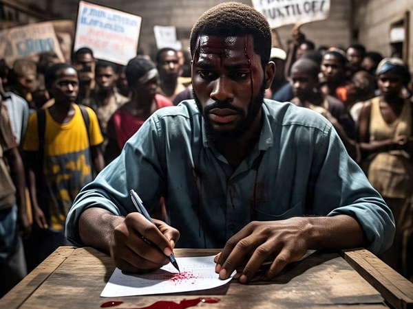 <p>I am out of ink to duel oppression's might,</p><p>To roar like a jungle king when justice takes flight.</p><p>But I will substitute my blood.</p><p><br></p><p>I am out of ink to lash out canes of words,</p><p>To unsit the pharaohs who rule with cursed iruke.</p><p>But I will use my blood.</p><p><br></p><p>I am out of ink to make the blind see,</p><p>The deaf hear the shenanigans that engulfed humanity.</p><p>But I will substitute with my blood.</p><p><br></p><p>I am out of ink ,</p><p>To illuminate, in the gloomy doom where every is dim.</p><p>But I will use my blood&nbsp;</p><p><br></p><p>Like Rabbi, I will give my body's ink,</p><p>To white the black, to right the wrong</p><p>To turn pale to nimble and to revive the</p><p>Justice midget craving, seeking not acclaim</p><p>But to balance the fault, where dismay have reigned.</p><p><br></p><p>I will use my ink of blood to expose the system's crack, reveal flaw and make the evil fall</p><p>The weight of my blood's word like a river will flow, and make the earth still so that justice will be heard</p><p>No longer silenced, my blood ink will roar,</p><p>With every drop,a truth will be unveiled , until justice stand tall...</p><p>&nbsp;©️ OLAREWAJU&nbsp;</p>