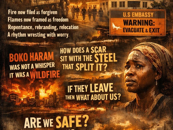 <p>They say a thousand former flames</p><p>have been poured into new bottles</p><p>carried from Borno State</p><p>to the marble heartbeat of Abuja</p><p><br/></p><p>Fire now filed as forgiven</p><p>flames now framed as freedom</p><p><br/></p><p>Repentance, rebranding, relocation</p><p>a rhythm of words wrestling with worry</p><p><br/></p><p>But worry will not wilt</p><p>it widens, it wakes, it watches</p><p><br/></p><p>Tell me</p><p>how does a scar sit with the steel that split it</p><p>blade to blood, bruise to breath</p><p>and not break again</p><p><br/></p><p>How does a grave greet the grief that grew it</p><p>dust to dusk, pain to pulse</p><p>and still call it peace</p><p><br/></p><p>Boko Haram</p><p>was not a whisper</p><p>it was a wildfire</p><p>wild winds whipping through weak walls</p><p>leaving lives in layers of loss</p><p><br/></p><p>You cannot perfume a battlefield</p><p>make mud into meadow</p><p>turn ruin into roses</p><p><br/></p><p>You cannot dress a wound in uniform</p><p>stitch scars with slogans</p><p>and sell it as healing</p><p><br/></p><p>Because trauma talks in textures</p><p>it trembles, it turns, it travels through time</p><p><br/></p><p>They say reformed</p><p>but the past performs in patterns</p><p>echoes in actions</p><p>lingers in looks we cannot read</p><p><br/></p><p>And now</p><p>far from our fires</p><p>voices rise across the sea</p><p><br/></p><p>United States</p><p>whispers warnings through its walls</p><p>embassies echoing exit, evacuation, emergency</p><p><br/></p><p>Foreign fears finding form in flight</p><p>diplomats departing,</p><p>signals sent without speeches</p><p><br/></p><p>If those who watch from windows afar</p><p>are worried enough to withdraw</p><p><br/></p><p>What then of those within the walls</p><p><br/></p><p>Repentance should be a river</p><p>rushing with reason, rich with reckoning</p><p>not a shallow stream of statements</p><p><br/></p><p>Where is the truth that tests the tongue</p><p>where is the justice that joins the journey</p><p><br/></p><p>Because what we see</p><p>feels like smoke shaping safety</p><p>soft, shifting, suffocating</p><p><br/></p><p>And the people</p><p>we breathe in fear, we bear its weight</p><p>we speak in questions stitched with caution</p><p><br/></p><p>Are we safe</p><p>secure or simply silent</p><p>protected or just patient</p><p><br/></p><p>Is this peace</p><p>or a pause dressed in promises</p><p><br/></p><p><br/></p><p>Safety is not movement of men</p><p>it is mending of minds</p><p><br/></p><p>Until then</p><p>Nigeria walks like a thought in the dark</p><p>careful, calculated, constantly checking</p><p><br/></p><p>Because when yesterday’s terror</p><p>returns in tailored uniforms</p><p><br/></p><p>and tomorrow’s allies</p><p>quietly pull away</p><p><br/></p><p>Even hope</p><p>steps slow</p><p>speaks soft</p><p>and stands unsure</p><p><br/></p><p>And still we ask</p><p>not in anger but in awareness</p><p><br/></p><p>Are we safe</p><p>or just surviving a story still unfolding</p><p><br/></p><p>Muhammad Mercurial🖋️</p>