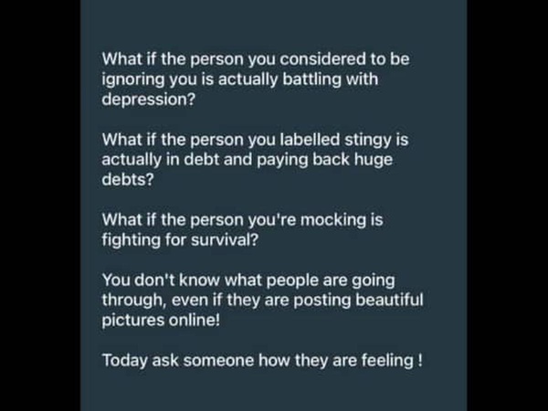 <p>I have been seeing this post for a while now, and I get it. </p><p><br/></p><p>We all get it. We understand that the person who seems to be ignoring you might be battling deep depression. We understand that the person labeled as stingy might be drowning in debt, and the one being mocked might just be fighting to survive another day.</p><p><br/></p><p>Yes, we know some people don't actually care and they're waiting for if you don't, they won't. Yes, such people exist.</p><p><br/></p><p>But here is the truth that often goes unsaid and I might need to be among the number of those who'd address this: no matter what you're dealing with, it shouldn't be an excuse to shut out the people who actually care.</p><p><br/></p><p>We know it is not easy for you. We know life is hitting you hard, and maybe you are just trying to keep your head above water, but please understand that we have things we are dealing with too.</p><p><br/></p><p> Life is messing with us just as much as it is messing with you. When we reach out, when we send that text or place that call, we are effectively putting our own burdens on hold just to see to your well-being. We are spending our limited emotional energy on you.</p><p><br/></p><p>It hurts when those messages are ignored for days, especially when we see you active online or posting pictures. </p><p><br/></p><p>We know you are trying to manage your emotions, and we know you cannot always respond immediately. But what about the moments when you feel a bit better? What about the moments when you have enough breath to say thank you?</p><p><br/></p><p>We are not complaining, but we are human too. When you respond with coldness or give us an attitude that suggests we are doing "too much" just by caring, it starts to wear us down.</p><p><br/></p><p>If I keep pouring into a cup that never pours back, I will eventually break. It is like exhausting myself to keep a fire going while I am freezing to death. What is feeding me back? Nothing. </p><p><br/></p><p>When I get drained from giving and giving, the smallest bit of rejection shatters me because I have nothing left to protect myself with.</p><p><br/></p><p>It is okay to be going through something, but please don't forget the hands that are reaching into the dark to find yours. We are struggling too, yet we chose not to let go of you.</p><p><br/></p><p>Many said I'm taking things personal... Please, help me here.. 😓 </p><p><br/></p><p>My question from this picture is, what if we check in and we're met with a wall? Huh? I'm dealing with something too..🤔 </p>