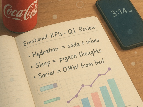 <p>In the spirit of bringing my whole self to work, and by work, I mean life, I decided to run a performance review on my own emotional state. Welcome to the quarterly check-in I never asked for, starring: Me, as both the manager and the reluctant employee of my own soul.</p><p></p><p>First up: my wellness department’s hydration KPI. Let’s just say the metrics are… carbonated. I run on Coke, and pure vibes. My dashboard flagged this weeks ago: “Hydration = 80% soda, 15% chaos, 5% actual water.” Not exactly the balanced intake my body’s board meeting agreed on.</p><p></p><p>Then there’s sleep. The goal was eight solid hours; the reality was five and a half, fractured by a 2 a.m Google dive into whether pigeons feel lonely. I may not be well-rested, but I am weirdly informed about urban bird social structures.</p><p></p><p>Social energy got its own metric. I’d aimed for meaningful connections and a balanced social battery. What happened? Four “on my way” texts sent from the comfort of my bed, and one late-night voice note from a friend that I actually listened to, all the way through. I was absent more than I was present, but when it counted, I was there.</p><p></p><p>Then there's the creativity department. It was supposed to be about fewer abandoned drafts. But instead, my Notes app became a graveyard of ideas. I started eight pieces and finished none. The output was scattered, but the spark stayed alive.</p><p></p><p>So here I am, touching base with my emotional KPIs. Maybe in the next quarter, I’ll drink one actual glass of water or just rename my system "Carbonated Chaos" and call it a hydration strategy.</p><p><br/></p><p>Either way, I’ll still be here, measuring my peace in pigeons at 2 am and my connections in voice notes actually heard. The metrics might stay messy, but at least I’m checking in.</p><p></p><p>And sometimes, showing up for your own review is the only KPI that really counts.</p><p></p><p></p>