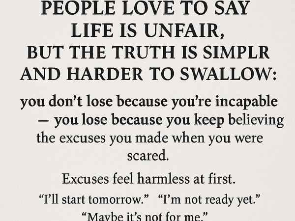 <p>People love to say life is unfair, but the truth is simpler and harder to swallow:</p><p>you don’t lose because you’re incapable you lose because you keep believing the excuses you made when you were scared.</p><p><br/></p><p>Excuses feel harmless at first.</p><p>“I’ll start tomorrow.”</p><p>“I’m not ready yet.”</p><p>“Maybe it’s not for me.”</p><p><br/></p><p>But say them enough times, and they stop sounding like lies</p><p>they start sounding like identity.</p><p><br/></p><p>You start calling fear “logic.”</p><p>You start calling doubt “realism.”</p><p>You start calling avoidance “patience.”</p><p><br/></p><p>And then one day, something breaks not in the world, but inside you.</p><p>A quiet realization:</p><p>“I’m the one holding me back.”</p><p><br/></p><p>That moment hurts.</p><p>But it’s the moment everything changes.</p><p><br/></p><p>Because once you get tired of your own excuses,</p><p>once you stop negotiating with the weaker version of yourself,</p><p>you meet a completely different you </p><p>the you that’s been buried under hesitation, doubt, and habit.</p><p><br/></p><p>A version that is sharper.</p><p>Hungrier.</p><p>More honest.</p><p>More dangerous in the best way.</p><p><br/></p><p>And once you meet that version of yourself,</p><p>you don’t want to go back.</p>